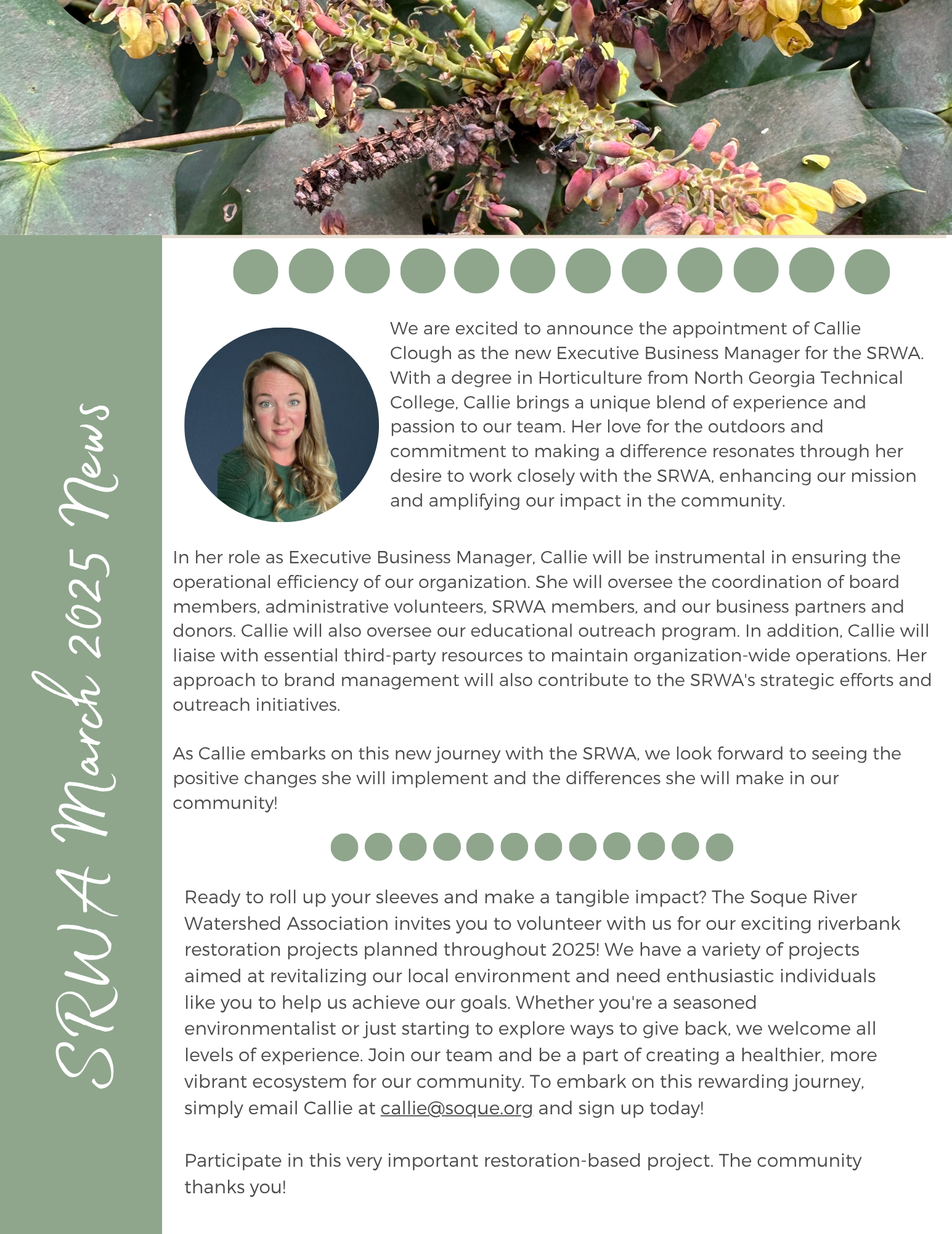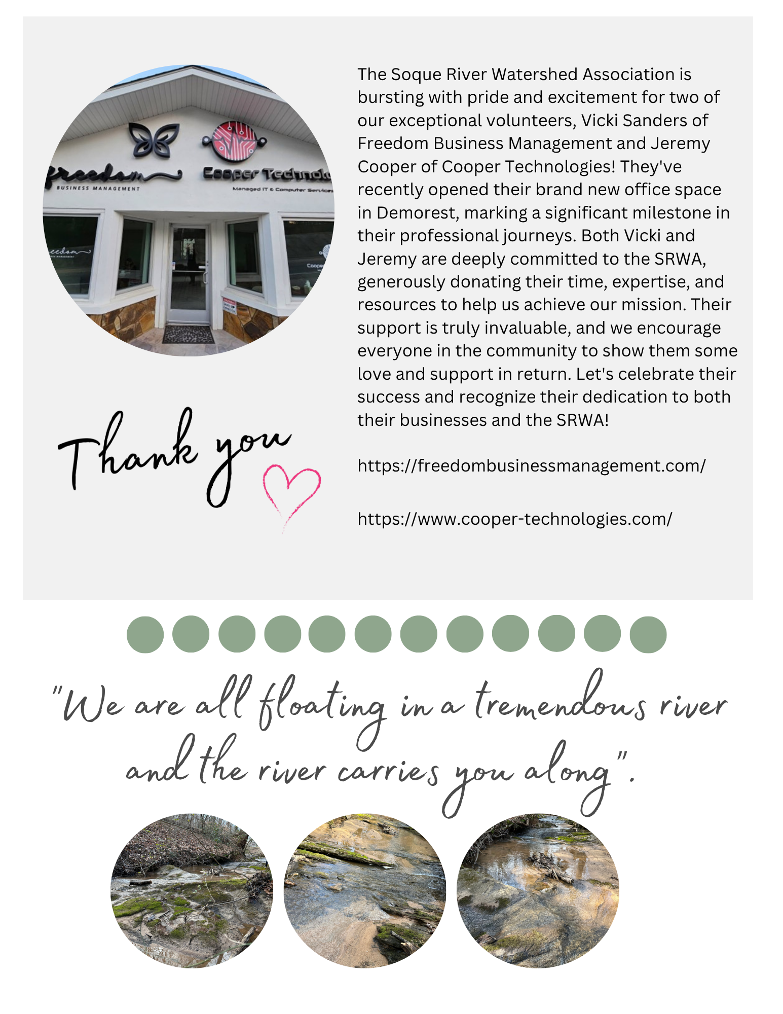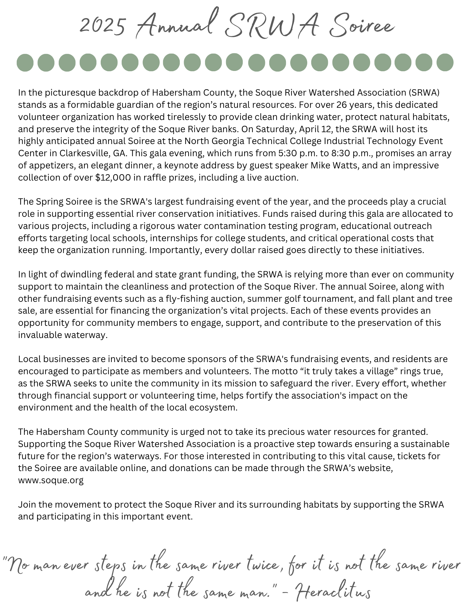 The Soque River Watershed Assocation (SRWA) is a non-profit organization working to protect and restore the Soque River in Northeast Georgia. The Soque River is the only river in Georgia to begin and end all within one county, Habersham. It is a major headwater tributary to the Chattahoochee River which serves as the primary drinking water supply for the city of Atlanta. The organization, founded in 1998, is governed by a community-oriented board of directors, and has two staff members. Primary activities of the Association include: organization of a community watershed partnership; grant management of a Federal 319 project to complete a watershed assessment and draft a watershed protection plan; coordination of a community greenway project; and collaboration with local officials on conservation policy and planning improvements.